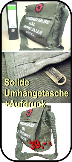 Diese kultige Tasche ist super-solide verarbeitet und mit fantastischen Tools versehen. Der "Vintage-Look" wird erst richtig perfekt, wenn Sie Ihren individuellen Druck platzieren. Dieser kann auch mehrfarbig sein (Aufpreis). In aller Regel wird der Flockdruck verwendet. Bei Fotos oder Pixelgrafiken muss evtl. das Verfahren mit dem textilen Zwischenträger verwendet werden. Rabatte sind möglich.